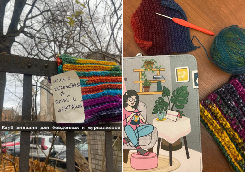 Сейчас я нахожусь в Латвии. Здесь много деклассированных людей в очень бедном положении. Я часто вяжу шарфы и снуды, чтобы отвлечься и успокоиться. А когда что-то делаешь, хочется, чтобы это имело смысл. Моя скорость производства — шесть шарфов в месяц, и в какой-то момент я стала развешивать их на заборах с запиской, что можно забирать и носить.