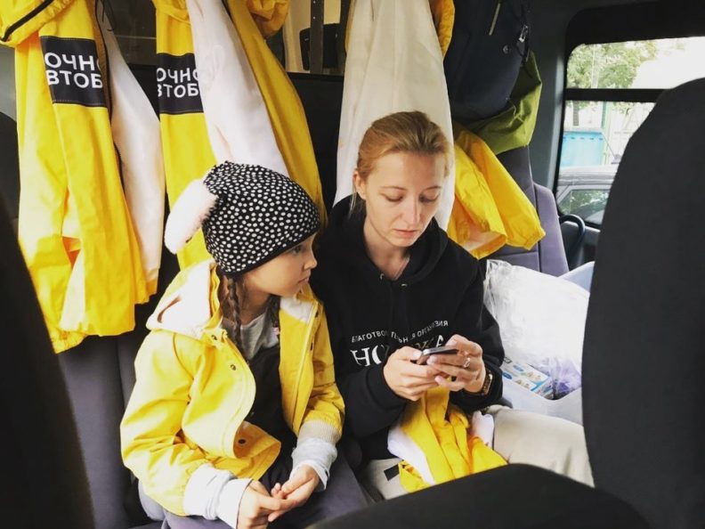 Первый раз я была в «Ночлежке» в Петербурге. Мне было пять и я не так много помню. Помню, что в офисе каталась со второго этажа на первый на трубе и в первый раз ела шаверму, а потом ездила на Ночном автобусе. Во время рейса хотелось спать и есть — было поздно, и Даша хвалила меня, что я не заснула. Помню, что раздавала бездомным людям хлеб и бутылки с водой. Страшно не было, было любопытно.