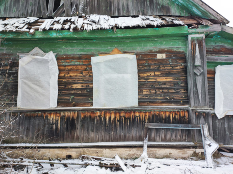 Деревня Заречье, расположенная между Торопцом и арсеналом, в прямом смысле выглядит как после бомбежки. Большинство домов оставлены: окна забиты фанерой, сквозь дырявые крыши светится серое небо. Заборы выглядят так, словно их ударили под дых. На ветру скрипят куски кровельного железа. В большом деревянном доме шесть окон затянуты плотной мутноватой пленкой, сквозь нее доносится стук молотка и бормотание телевизора.