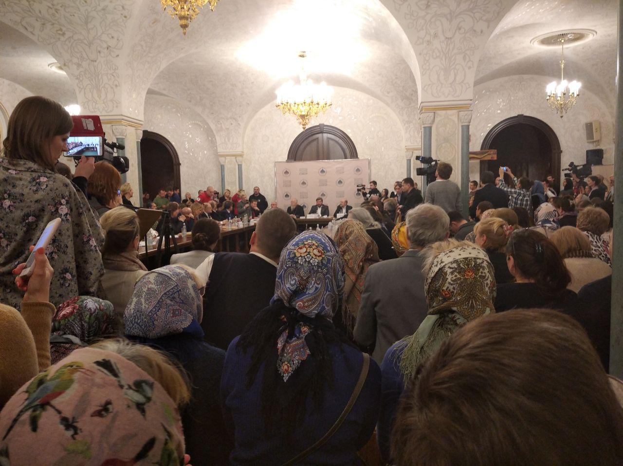 Заседание, посвященное теме домашнего насилия, прошло в Белом зале с изображениями православных святых на стенах. В нем собрались порядка четырехсот человек. Зал заполнился полностью, найти сидячее место практически невозможно.