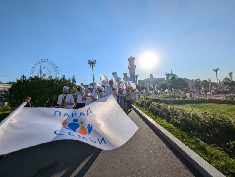 Марширующие выкрикивают: «Россия — семья семей! Ура! Ура! Ура!». Шествие длится не больше двадцати минут, стартует от Северной петли кольцевой дороги ВДНХ и заканчивается перед главной сценой напротив фонтана «Дружбы народов». Организаторы мероприятия и несколько многодетных семей, которых будут награждать, уходят в другую сторону и позже появляются на сцене.