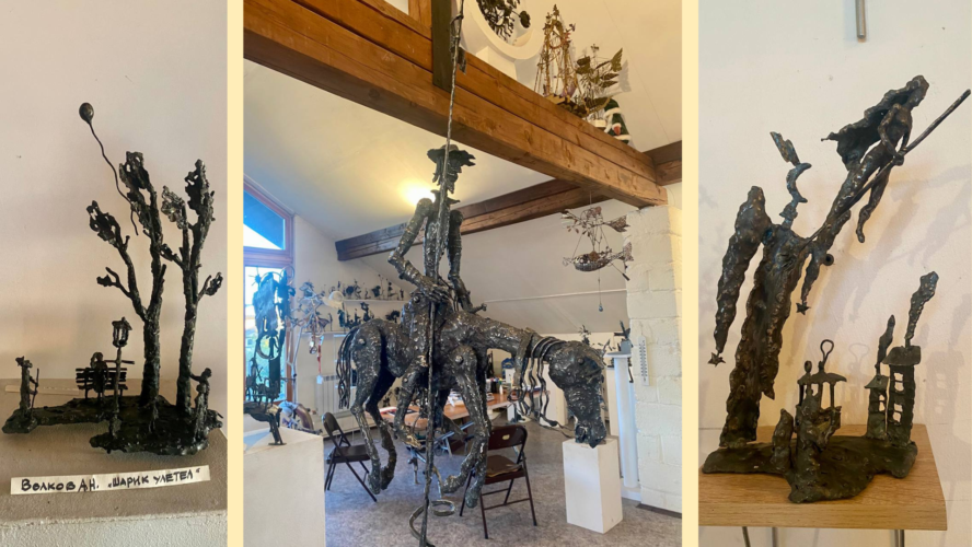 Экспозиция работ скульптора начинается сразу, как только попадаешь на участок: перед входом сидит железный ворон на высоком пруте, ворота в гараж украшают две фигуры молодых девушек в полете, которые держатся за руки — скульптор объясняет, что так он изобразил дружбу России и Америки. Чтобы попасть в галерею Волкова, нужно залезть в дом через окно на мансардном этаже — для этого скульптор сам выковал и пристроил железную винтовую лестницу.