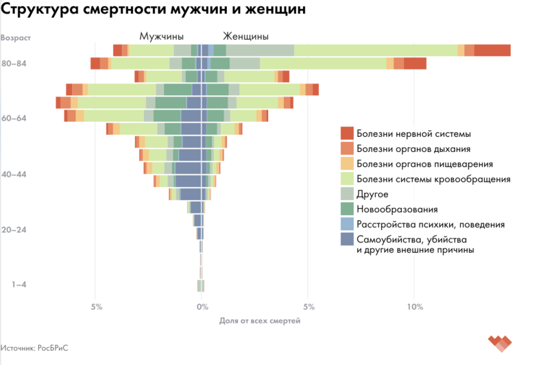 Сегодняшний дисбаланс объясним именно высоким уровнем бытовой смертности мужчин по сравнению с женщинами. Часто гибель российских мужчин объяснима внешними причинами: убийствами, самоубийствами, ДТП и прочими несчастными случаям. Очень высок уровень смертности мужчин от хронических болезней. Образ жизни, который ведут многие из них, часто приводит к раннему прогрессированию этих болезней, объясняет демограф. Например, в России коэффициент смертности от сердечно-сосудистых заболеваний у мужчин 16-59 лет в 3,1 раза выше, чем у женщин.