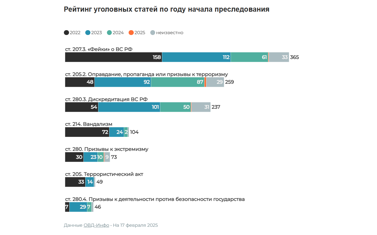 Большинство людей преследовали по первой части статьи, которая предполагает, что человек должен иметь минимум два решения суда по административным делам о дискредитации в течение одного календарного года. Это объясняет, почему пик применения этой статьи пришелся на 2023 год: за это время с начала вторжения у большинства политических преследуемых как раз появились вторые решения суда.